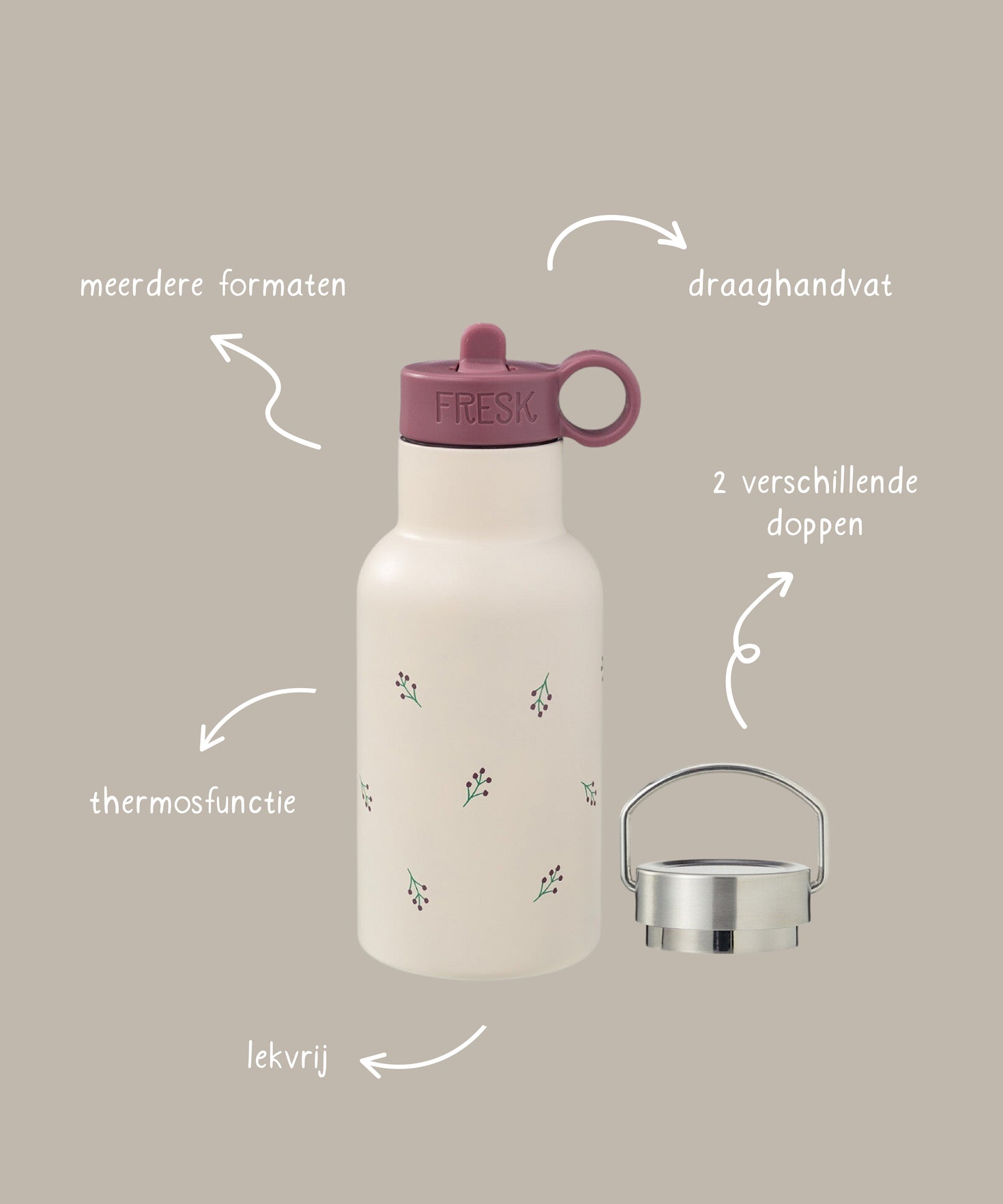 Deze veelzijdige thermos drinkfles van Fresk komt in twee formaten, 350ml en 500ml en wordt geleverd met twee verschillende doppen. De sportdop met rietje is ideaal voor snelle slokjes tussen het spelen door. De RVS schroefdop heeft een thermosfunctie. Warme dranken blijven warm en koude dranken blijven koud, tot wel 6-8 uur lang.