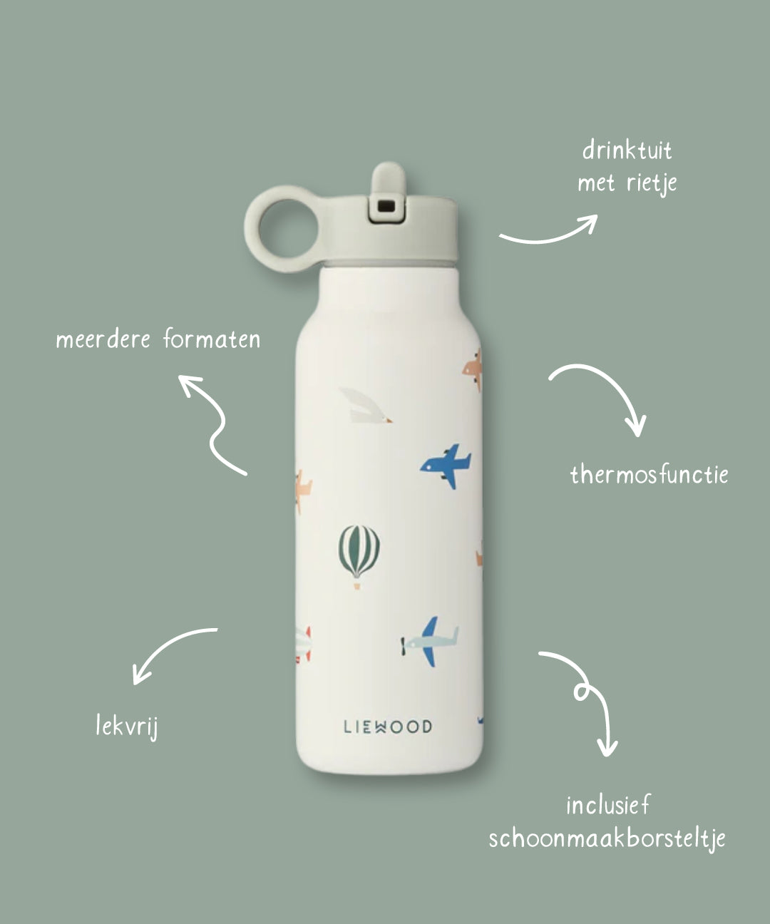 De sportdop voor deze fles is los verkrijgbaar, net als nieuwe rietjes. Zo blijft de fles extra lang bruikbaar.