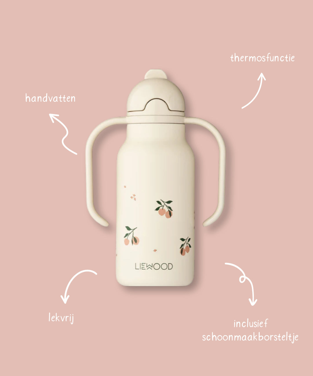 De Liewood RVS thermosfles Kimmie is zo’n fles die vanaf het allereerste moment mee op pad gaat. De fles heeft een inhoud van 250ml. Kleine handjes pakken de stevige handvatten makkelijk vast en dankzij het siliconen rietje drinken peuters hun water of melk zonder geknoei. Je krijgt er een schoonmaakborsteltje bij waarmee je het rietje goed van binnen kunt reinigen.