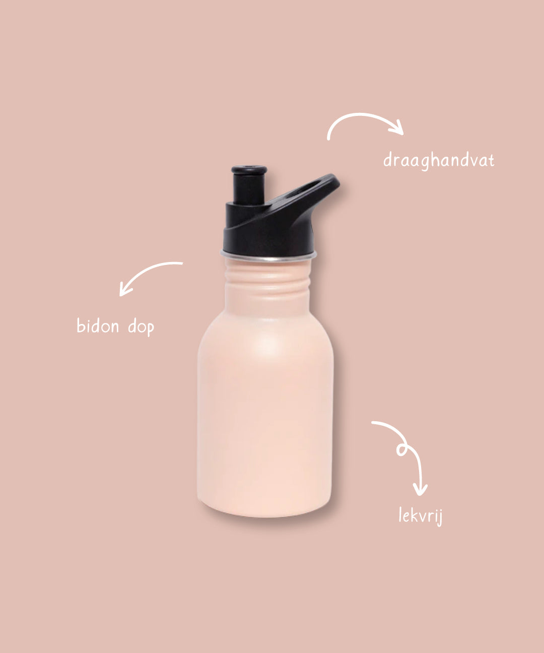 Het handvat bovenop is ideaal voor kleine handen. Kinderen pakken de fles er makkelijk zelf bij, dragen hem aan een vinger of aan hun tas. En dankzij de bidon dop is drinken geen gedoe: dop open, snelle slok, weer dicht en door! Geen geklik, gedraai of geknoei.